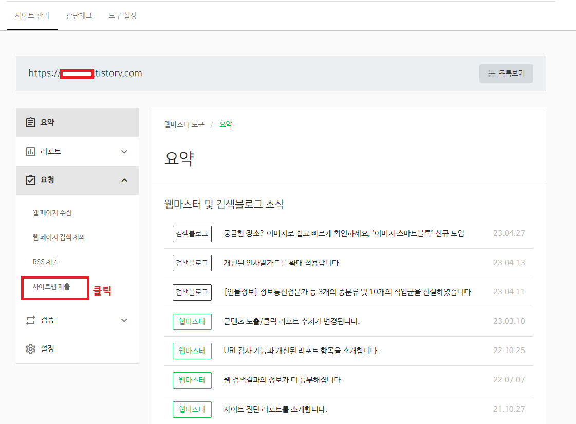 검증에서 URL 검사를 클릭 후 사이트맵, RSS 제출, 소유권 확인한 자신의 블로그 주소를 입력합니다.