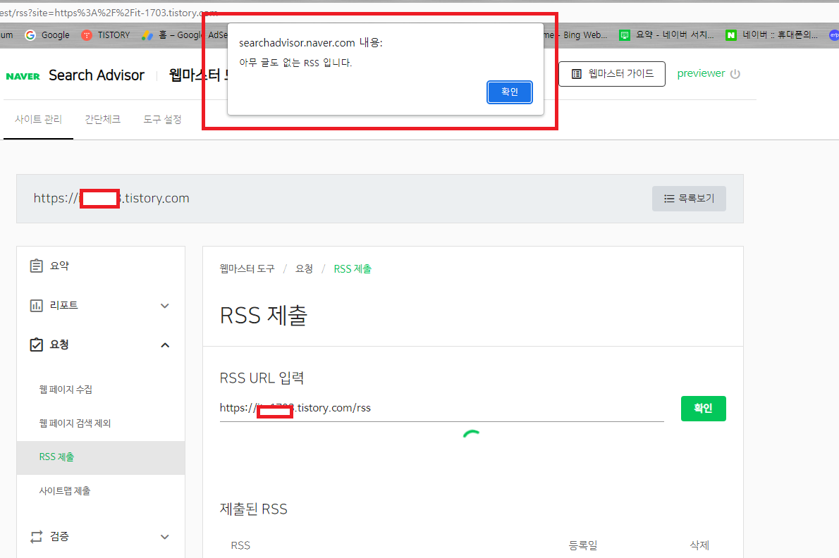 요청에서 RSS 제출 클릭하셔서 들어가신 후에 위쪽에 본인 블로그 주소 그대로 복사하셔서 RSS URL 입력란에 붙여 넣기 한 후 /rss라고 입력하신 후 확인을 누르시면 됩니다.