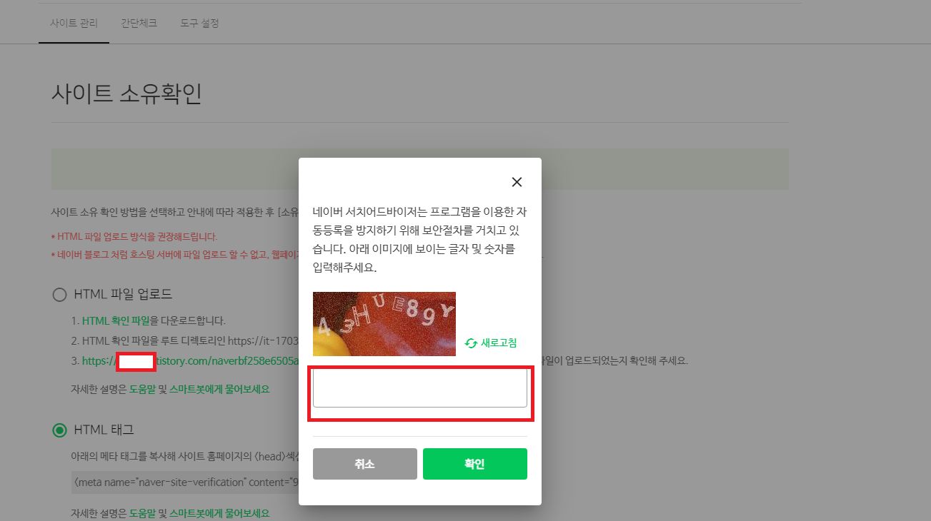 본인 블로그 URL을 입력하고 화살표를 누르면 '사이트 소유확인'이라는 창이 나오는데요.