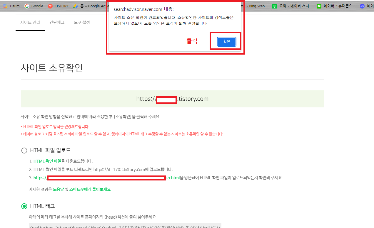 이렇게 사이트 소유권확인이 완료됐다고 창이 뜨면 정상적으로 잘하신 겁니다.